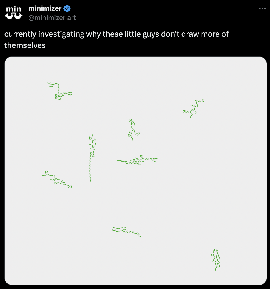 numbersinmotionI think that is really poetic and evokes the idea of daydreaming perfectly β€οΈDid you run into any bugs while working on the project? Or any happy accidents?minimizerYes so many π I think my favorite one was when the lines just would not draw.https://twitter.com/minimizer_art/status/1621231692118736902